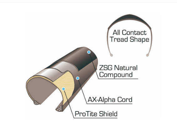 接地面與側邊是雙層材質橡膠。採用ZSG等技術,把正面和側面的不同特性橡膠結合,