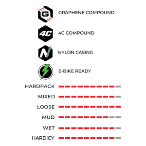 The Mazza Enduro’s 4C tread blends four Graphene-infused compounds to minimize rolling resistance, maximize confident grip, and boost durability and battery life. The two-ply 120-TPI nylon Enduro TLR casing features a two-ply construction that’s abrasion-resistant, supple, and puncture resistant, reinforced with added protection against rim strikes, pinch flats, and low sidewall cuts.